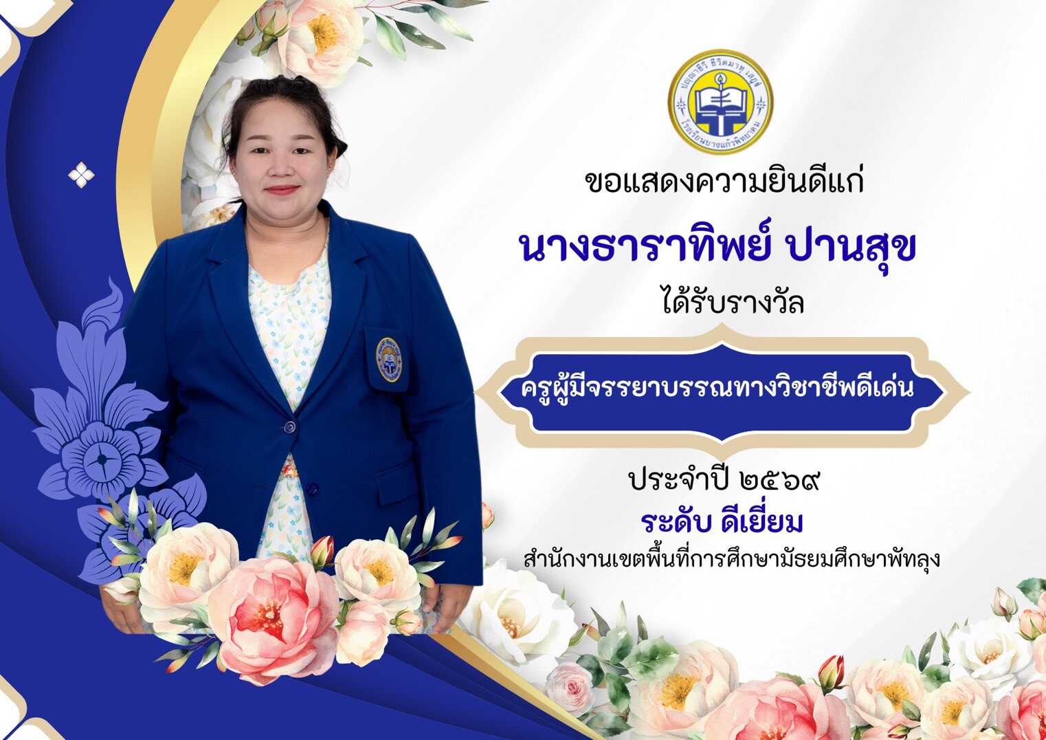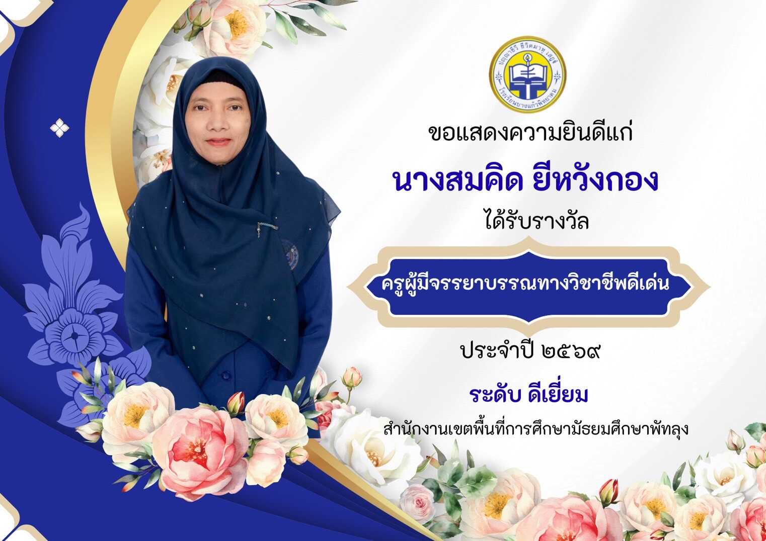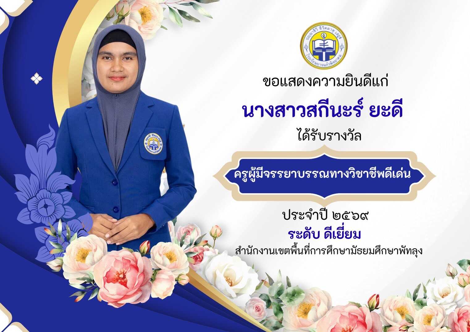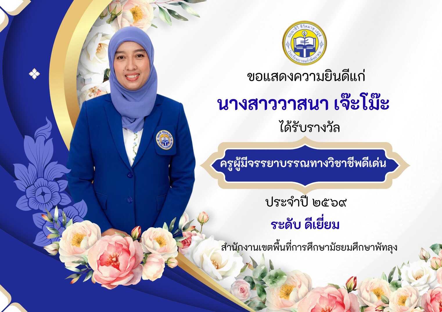 ผลการคัดเลือกรางวัลครูมีจรรยาบรรณทางวิชาชีพดีเด่น ประจำปี 2569 สำนักงานเขตพื้นที่การศึกษามัธยมศึกษาพัทลุง ระดับดีเยี่ยม