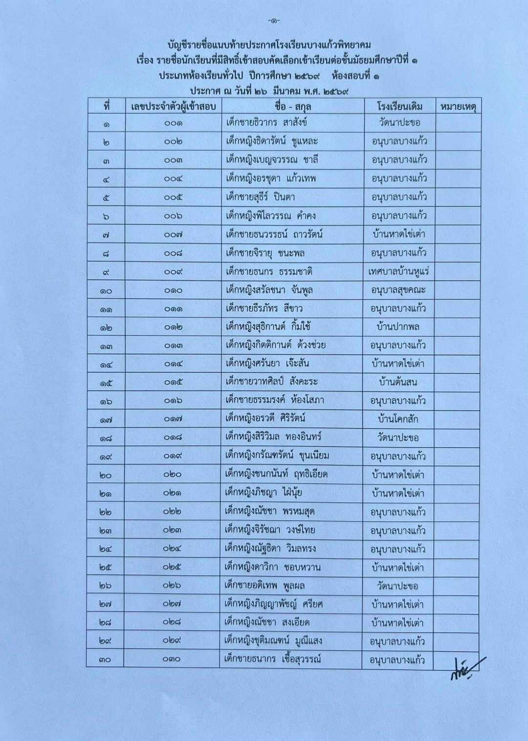 รายชื่อนักเรียนที่มีสิทธิ์เข้าสอบคัดเลือกเข้าเรียนต่อชั้นมัธยมศึกษาปีที่ 1 ประเภทห้องเรียนทั่วไป ประจำปีการศึกษา 2569
