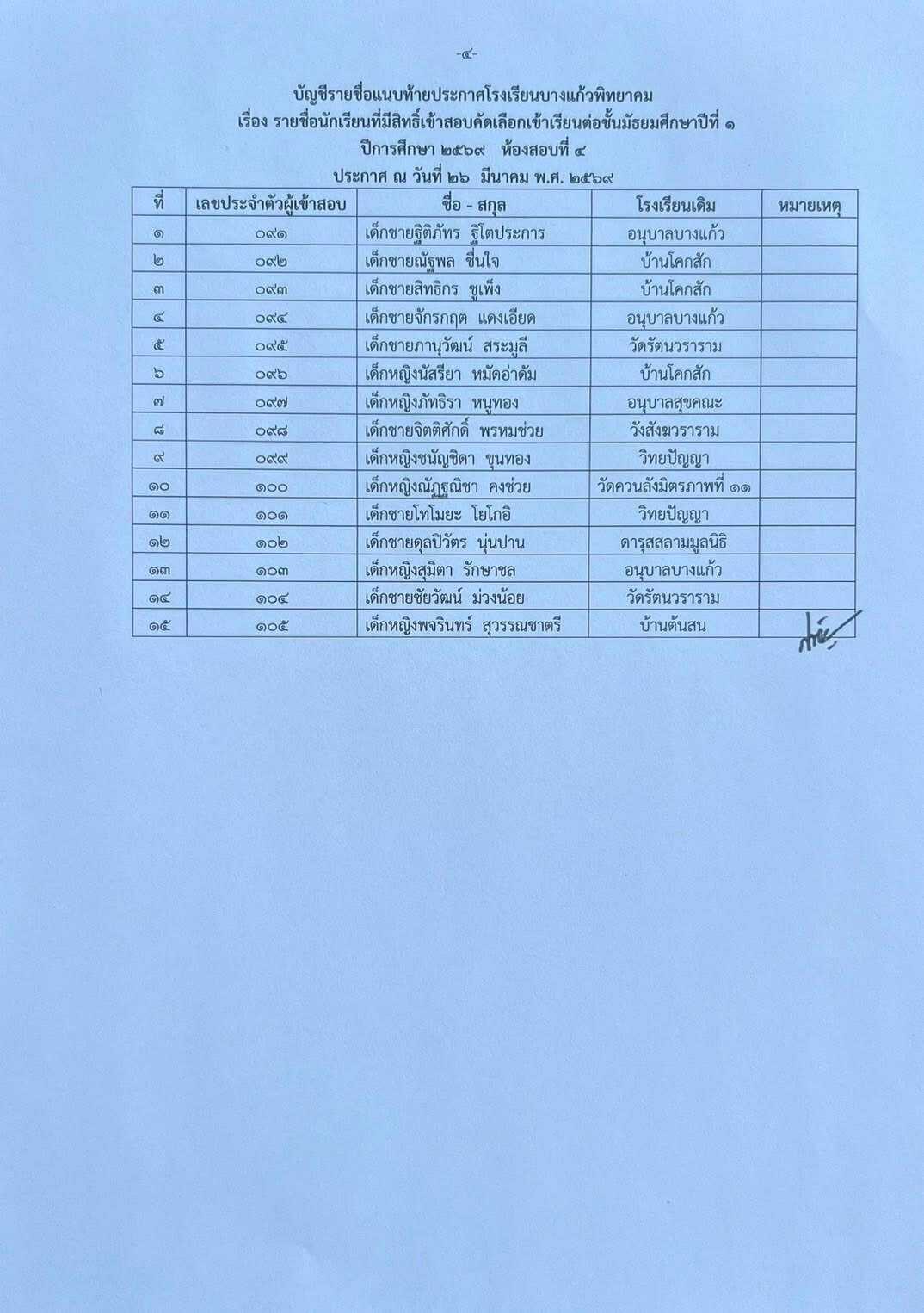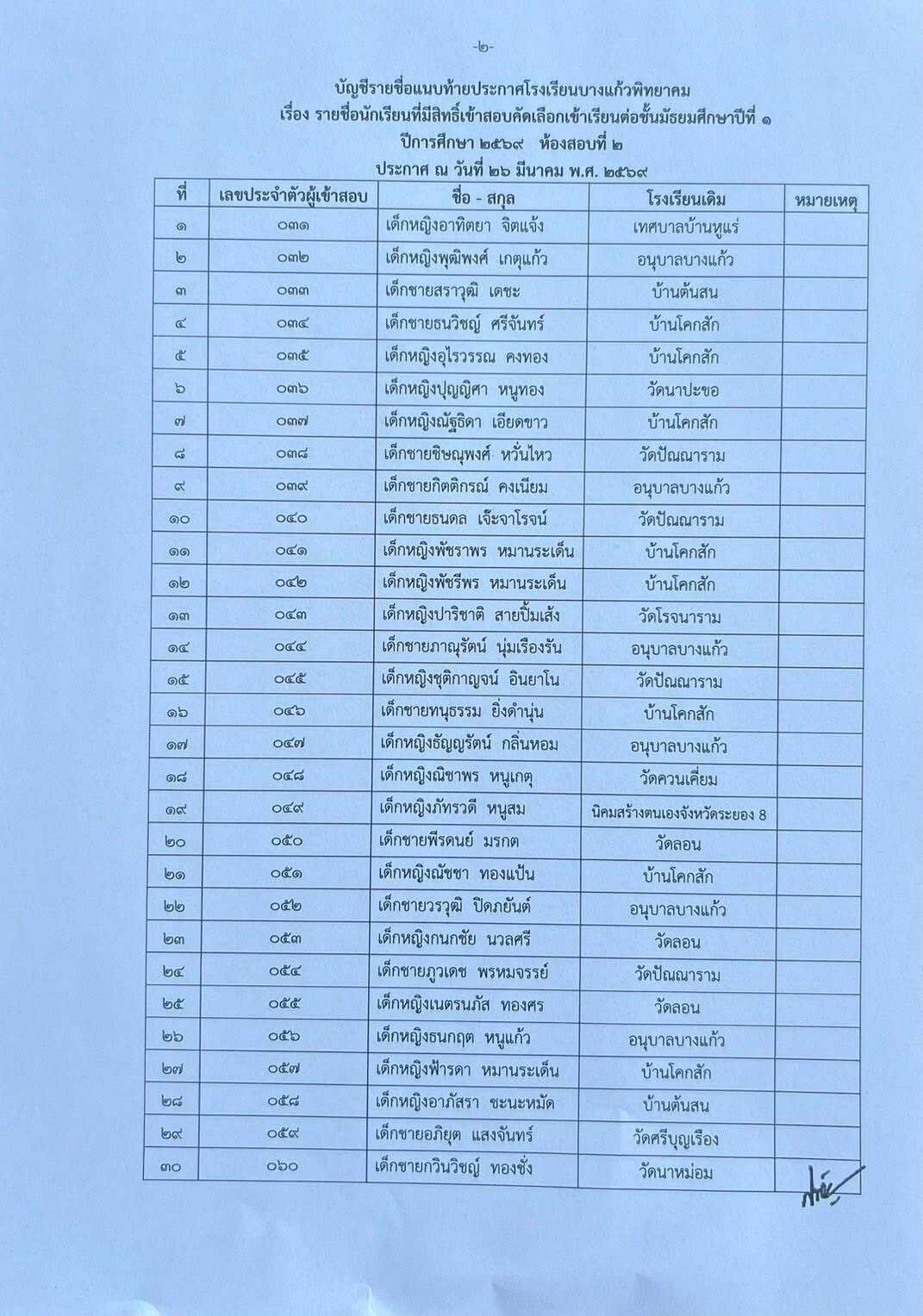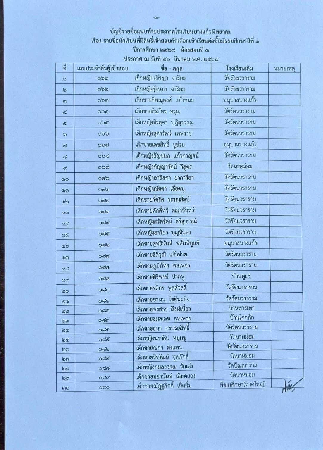 ประกาศโรงเรียนบางแก้วพิทยาคม รายชื่อนักเรียนที่มีสิทธิ์เข้าสอบคัดเลือกเข้าเรียนต่อชั้นมัธยมศึกษาปีที่ 1 ประเภทห้องเรียนทั่วไป ประจำปีการศึกษา 2569 ให้ผู้มีสิทธิ์สอบคัดเลือก มาสอบในวันเสาร์ ที่ 28 มีนาคม 2569 เวลา 08.30-11.00 น. ณ อาคารเรียน 1 โรงเรียน