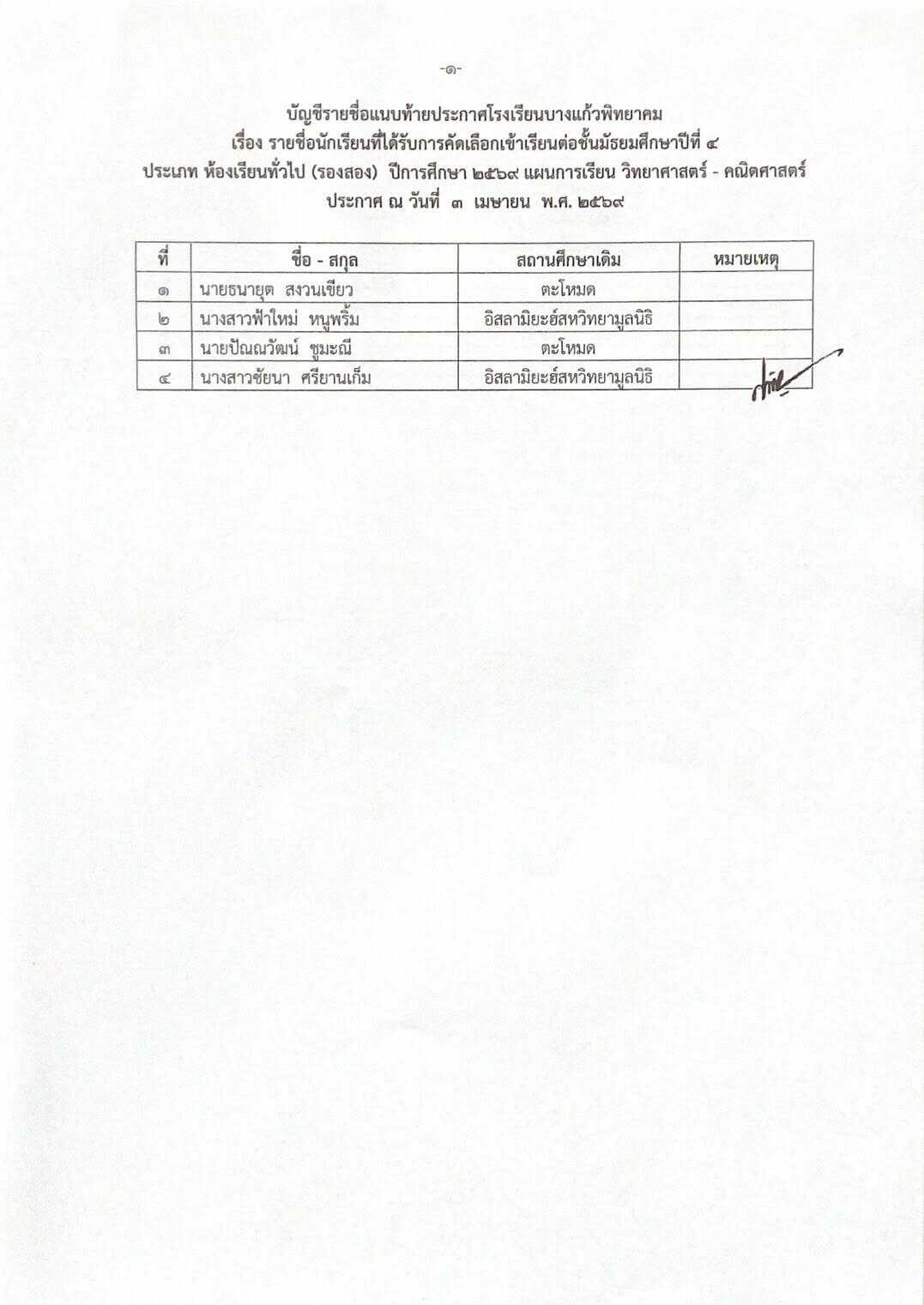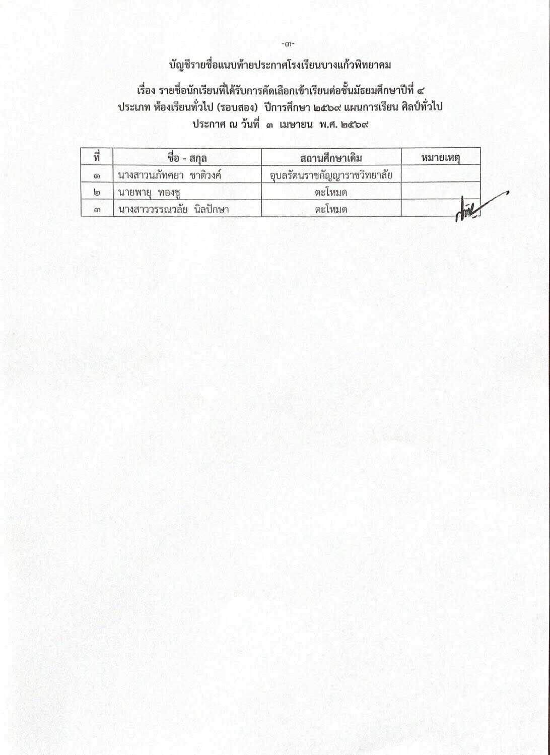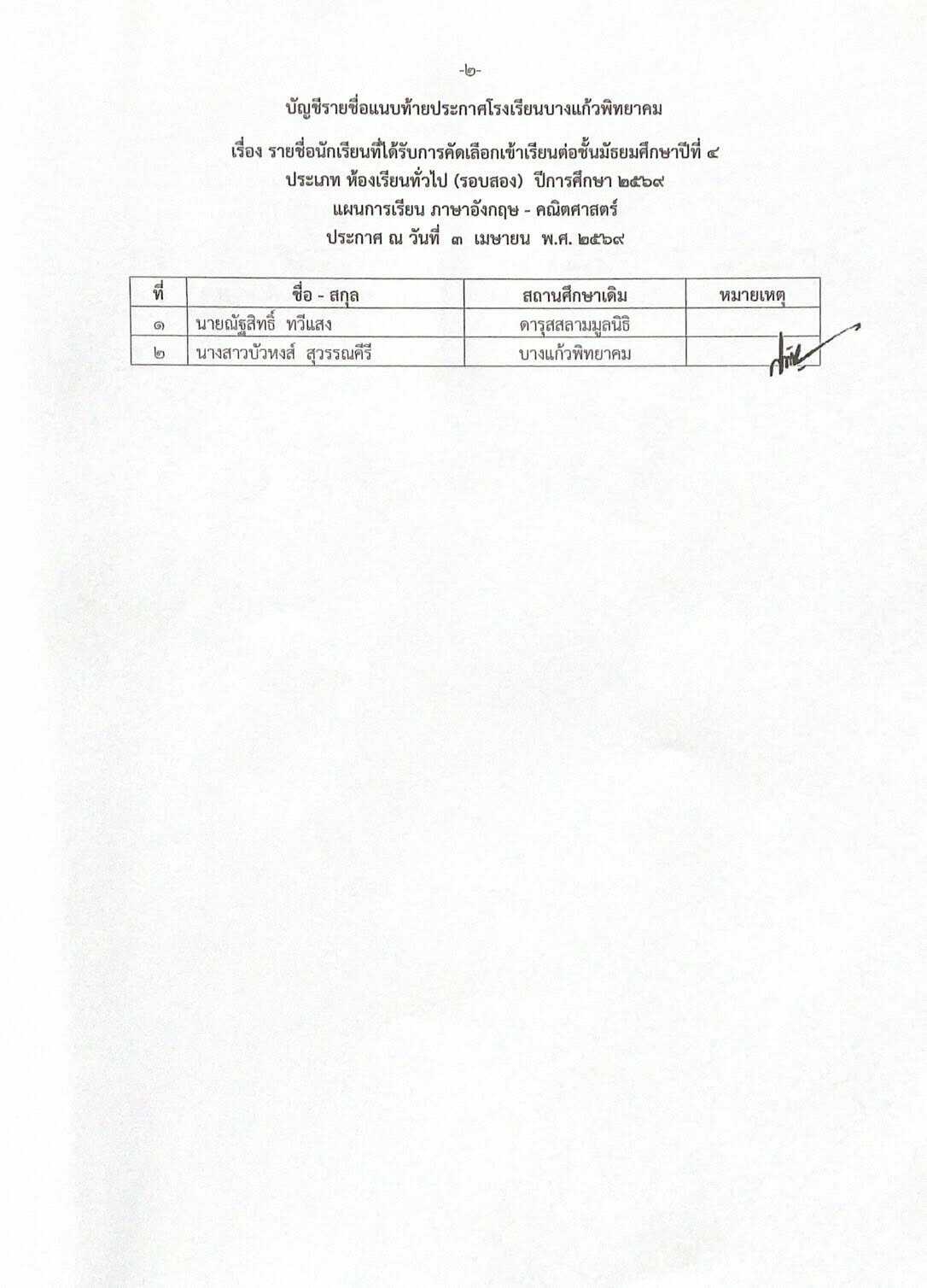 ประกาศโรงเรียนบางแก้วพิทยาคม เรื่อง รายชื่อนักเรียนที่ได้รับการคัดเลือกเข้าเรียนต่อชั้นมัธยมศึกษาปีที่ 4 ประเภทห้องเรียนทั่วไป (รอบสอง) ประจำปีการศึกษา 2569