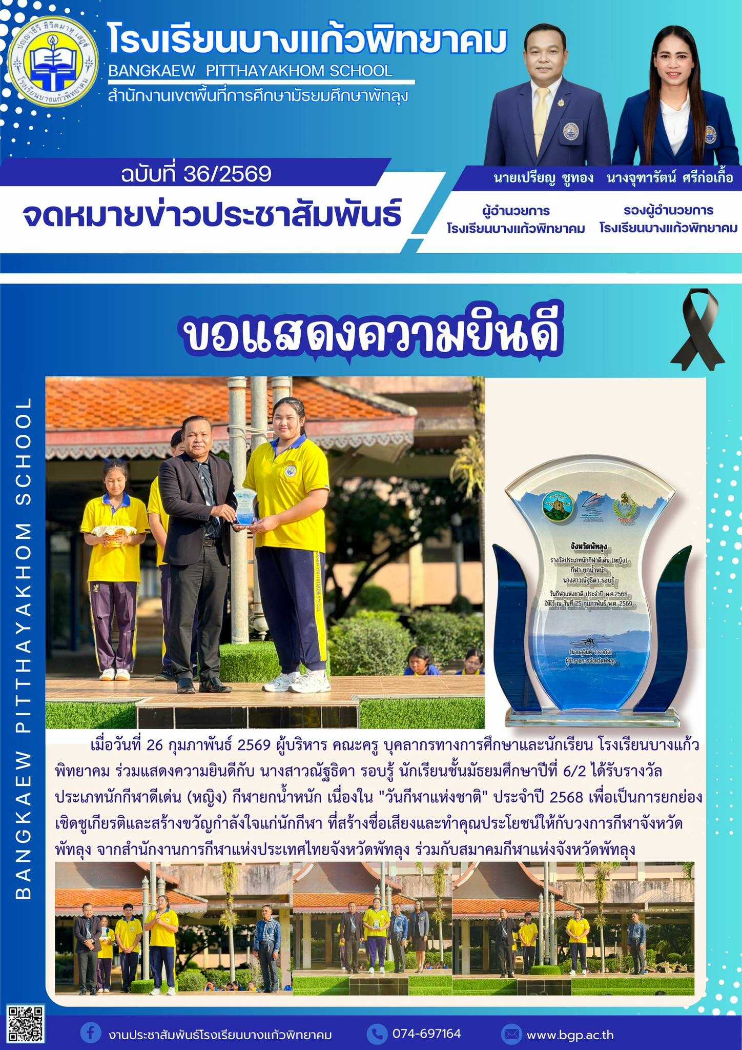 | เมื่อวันที่ 26 กุมภาพันธ์ 2569 ผู้บริหาร คณะครู บุคลากรทางการศึกษาและนักเรียน โรงเรียนบางแก้วพิทยาคม ร่วมแสดงความยินดีกับ นางสาวณัฐธิดา รอบรู้ นักเรียนชั้นมัธยมศึกษาปีที่ 6/2 ได้รับรางวัลประเภทนักกีฬาดีเด่น (หญิง) กีฬายกน้ำหนัก เนื่องใน "วันกีฬาแห่งชาติ" ประจำปี 2568 เพื่อเป็นการยกย่อง เชิดชูเกียรติและสร้างขวัญกำลังใจแก่นักกีฬา ที่สร้างชื่อเสียงและทำคุณประโยชน์ให้กับวงการกีฬาจังหวัดพัทลุง จากสำนักงานการกีฬาแห่งประเทศไทยจังหวัดพัทลุง ร่วมกับสมาคมกีฬาแห่งจังหวัดพัทลุง |