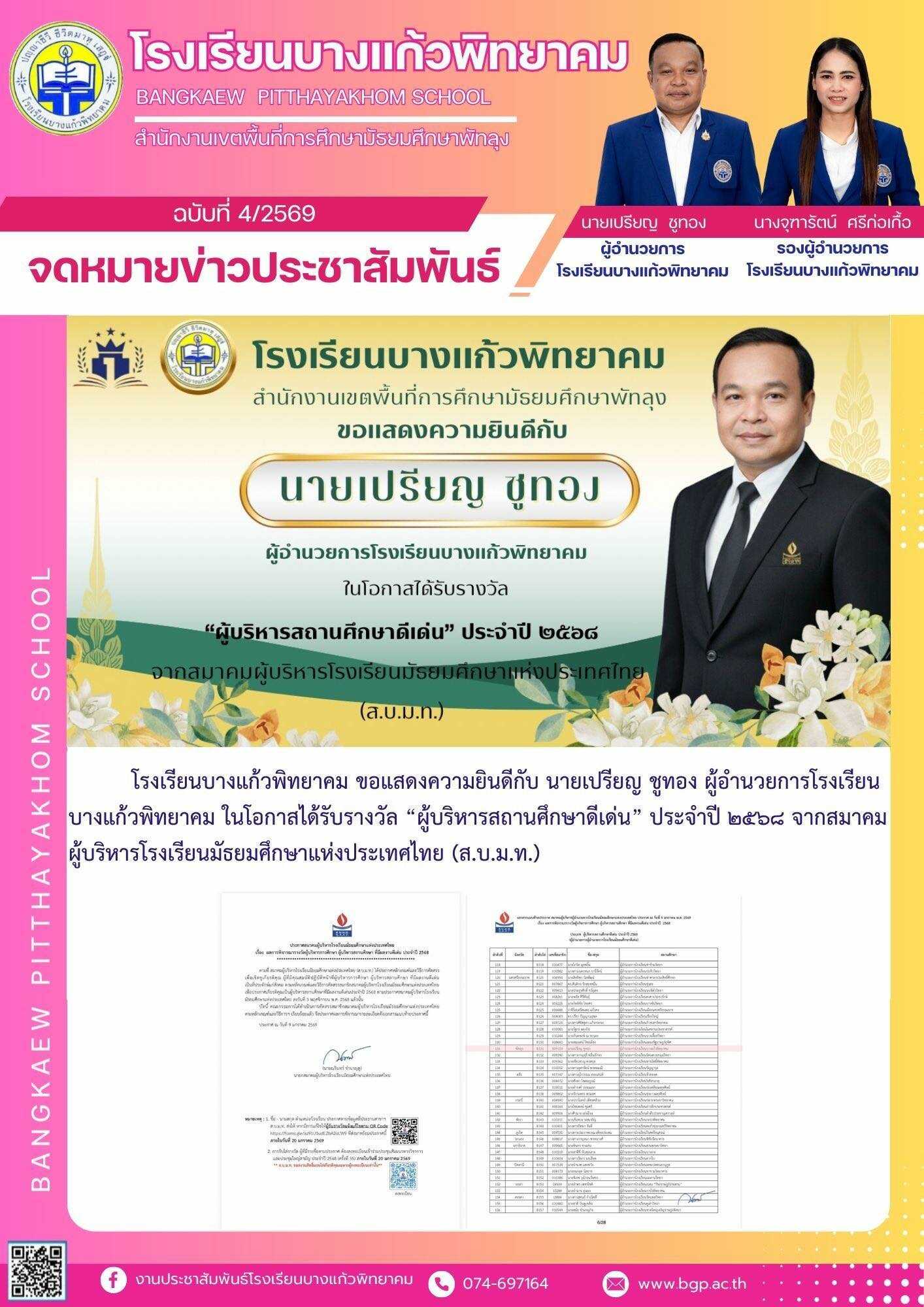 นายเปรียญ ชูทอง ผู้อำนวยการโรงเรียนบางแก้วพิทยาคม ในโอกาสได้รับรางวัล “ผู้บริหารสถานศึกษาดีเด่น” ประจำปี ๒๕๖๘ จากสมาคมผู้บริหารโรงเรียนมัธยมศึกษาแห่งประเทศไทย (ส.บ.ม.ท.) |