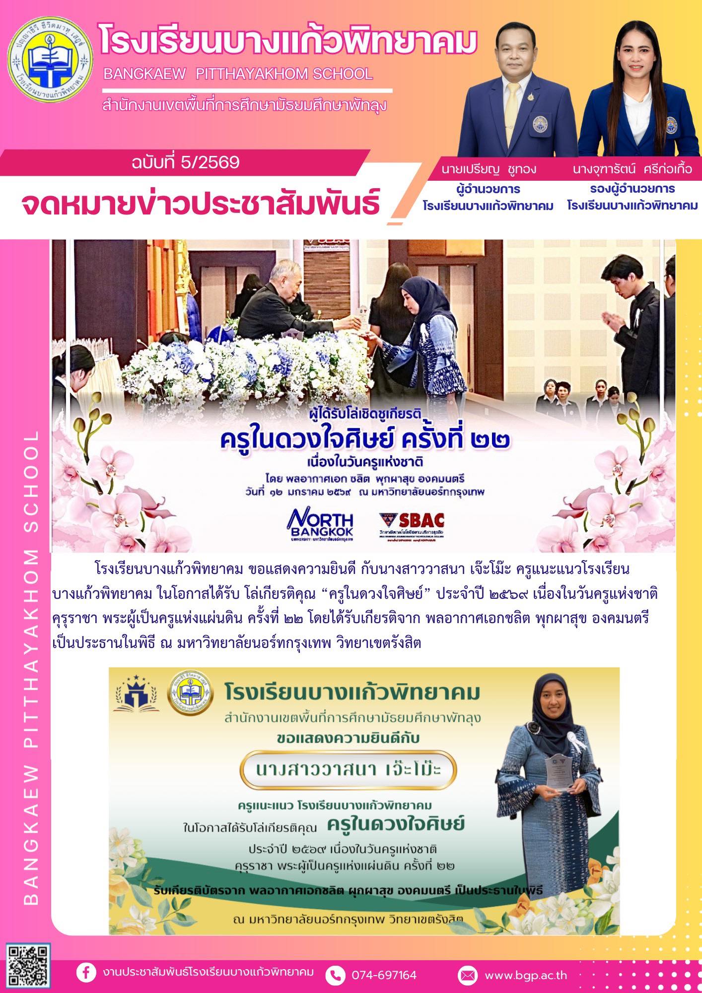 | โรงเรียนบางแก้วพิทยาคม ขอแสดงความยินดี กับนางสาววาสนา เจ๊ะโม๊ะ ครูแนะแนวโรงเรียนบางแก้วพิทยาคม ในโอกาสได้รับ โล่เกียรติคุณ “ครูในดวงใจศิษย์” ประจำปี ๒๕๖๙ เนื่องในวันครูแห่งชาติ คุรุราชา พระผู้เป็นครูแห่งแผ่นดิน ครั้งที่ ๒๒ โดยได้รับเกียรติจาก พลอากาศเอกชลิต พุกผาสุข องคมนตรี เป็นประธานในพิธี ณ มหาวิทยาลัยนอร์ทกรุงเทพ วิทยาเขตรังสิต |