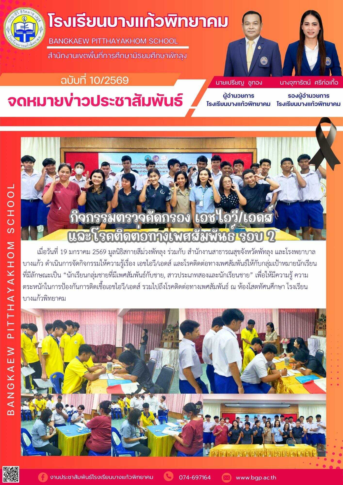 เมื่อวันที่ 19 มกราคม 2569 มูลนิธิสกายสีม่วงพัทลุง ร่วมกับ สำนักงานสาธารณสุขจังหวัดพัทลุง และโรงพยาบาลบางแก้ว ดำเนินการจัดกิจกรรมให้ความรู้เรื่อง เอชไอวี/เอดส์ และโรคติดต่อทางเพศสัมพันธ์ให้กับกลุ่มเป้าหมายนักเรียนที่มีลักษณะเป็น “นักเรียนกลุ่มชายที่มีเพศสัมพันธ์กับชาย, สาวประเภทสองและนักเรียนชาย” เพื่อให้มีความรู้ ความตระหนักในการป้องกันการติดเชื้อเอชไอวี/เอดส์ รวมไปถึงโรคติดต่อทางเพศสัมพันธ์ ณ ห้องโสตทัศนศึกษา โรงเรียนบางแก้วพิทยาคม