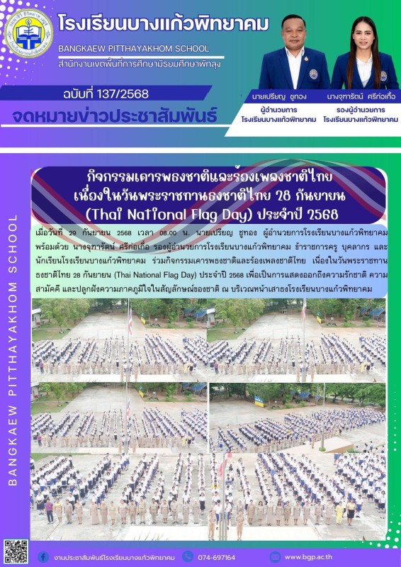 เมื่อวันที่ 29 กันยายน 2568 เวลา 08.00 น. นายเปรียญ ชูทอง ผู้อำนวยการโรงเรียนบางแก้วพิทยาคม พร้อมด้วย นางจุฑารัตน์ ศรีก่อเกื้อ รองผู้อำนวยการโรงเรียนบางแก้วพิทยาคม ข้าราชการครู บุคลากร และนักเรียนโรงเรียนบางแก้วพิทยาคม ร่วมกิจกรรมเคารพธงชาติและร้องเพลงชาต
