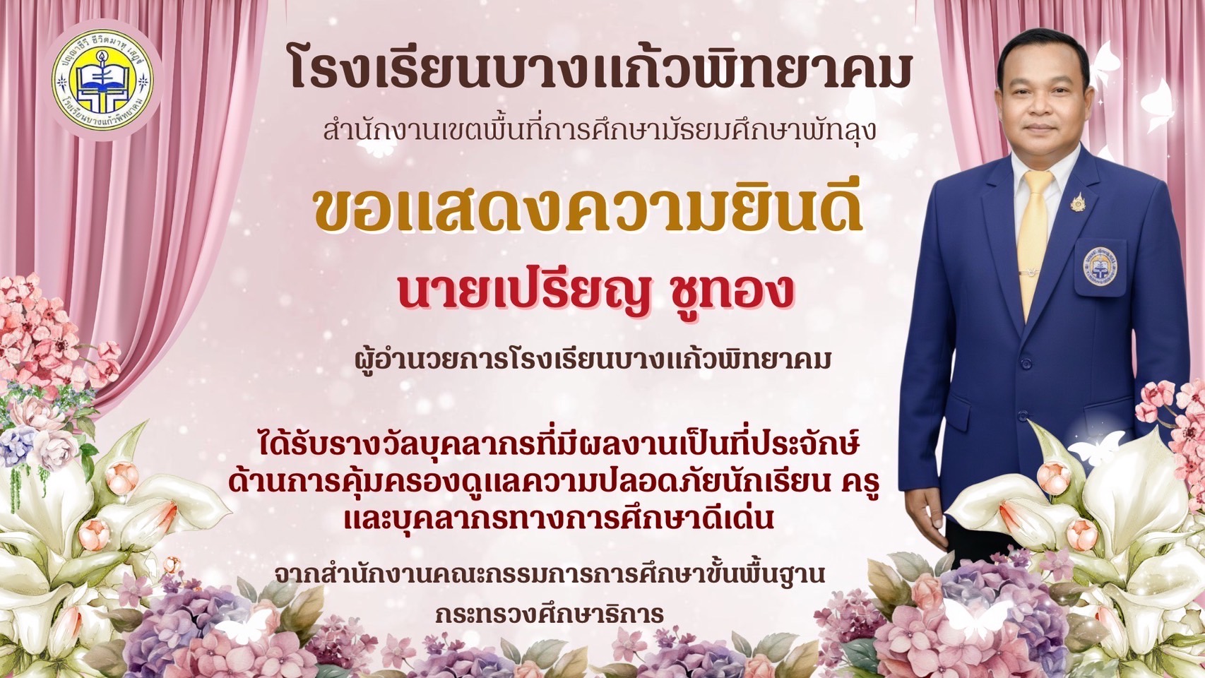 ขอแสดงความยินดีกับท่านผู้อำนวยการ นายเปรียญ ชูทอง ได้รับรางวัลบุคลากรที่มีผลงานเป็นที่ประจักษ์ ด้านการคุ้มครองดูแลความปลอดภัยนักเรียน ครูและบุคลากรทางการศึกษาดีเด่น จากสำนักงานคณะกรรมการการศึกษาขั้นพื้นฐาน