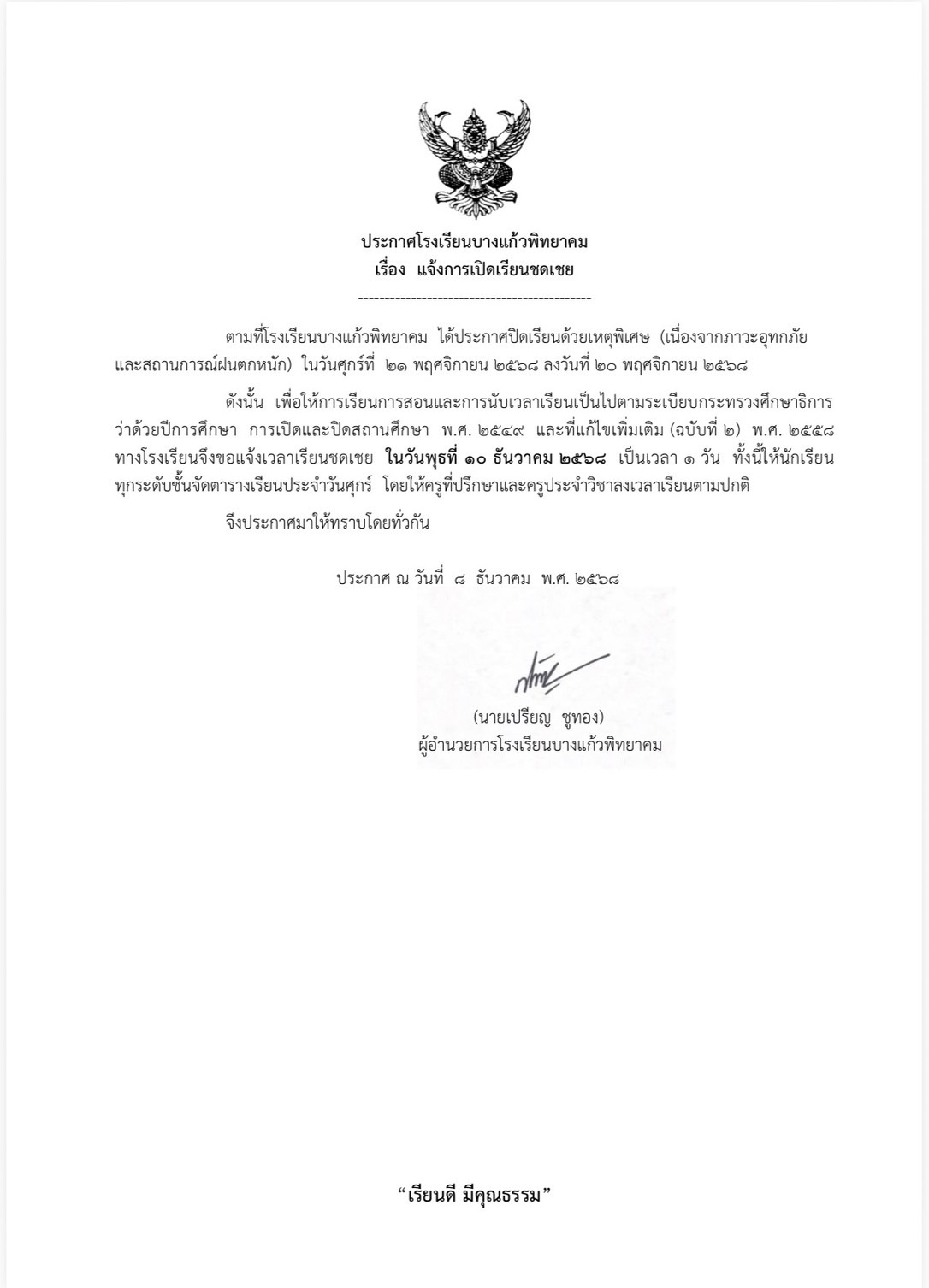 ประกาศ เรื่องกำหนดการเปิดเรียนชดเชย วันพุธที่ 10 ธ.ค. 2568