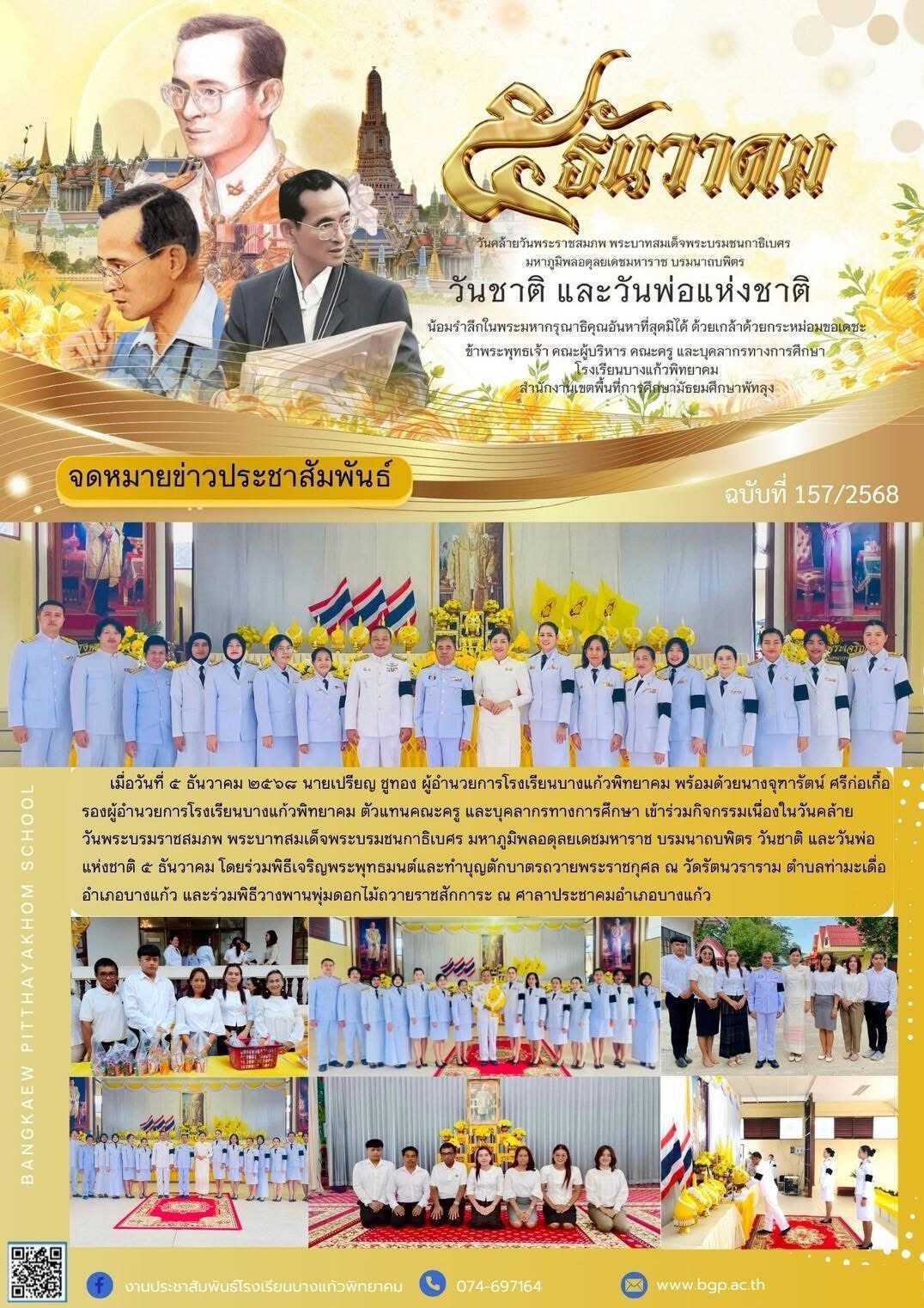 นายเปรียญ ชูทอง ผู้อำนวยการโรงเรียนบางแก้วพิทยาคม พร้อมด้วยนางจุฑารัตน์ ศรีก่อเกื้อ รองผู้อำนวยการโรงเรียนบางแก้วพิทยาคม ตัวแทนคณะครู และบุคลากรทางการศึกษา เข้าร่วมกิจกรรมเนื่องในวันคล้ายวันพระบรมราชสมภพ พระบาทสมเด็จพระบรมชนกาธิเบศร มหาภูมิพลอดุลยเดชมหาราช บรมนาถบพิตร วันชาติ และวันพ่อแห่งชาติ ๕ ธันวาคม โดยร่วมพิธีเจริญพระพุทธมนต์และทำบุญตักบาตรถวายพระราชกุศล ณ วัดรัตนวราราม ตำบลท่ามะเดื่อ อำเภอบางแก้ว และร่วมพิธีวางพานพุ่มดอกไม้ถวายราชสักการะ ณ ศาลาประชาคมอำเภอบางแก้ว |