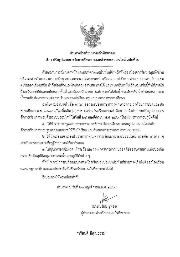 ประกาศโรงเรียนบางแก้วพิทยาคม เรื่อง ปรับรูปแบบการจัดการเรียนการสอนด้วยระบบออนไลน์ ฉบับที่ 2 ?️☔️ ในวันจันทร์ ที่ 24 พฤศจิกายน 2568 ให้นักเรียนเข้าเรียนในรายวิชาตามตารางเรียนผ่านระบบออนไลน์