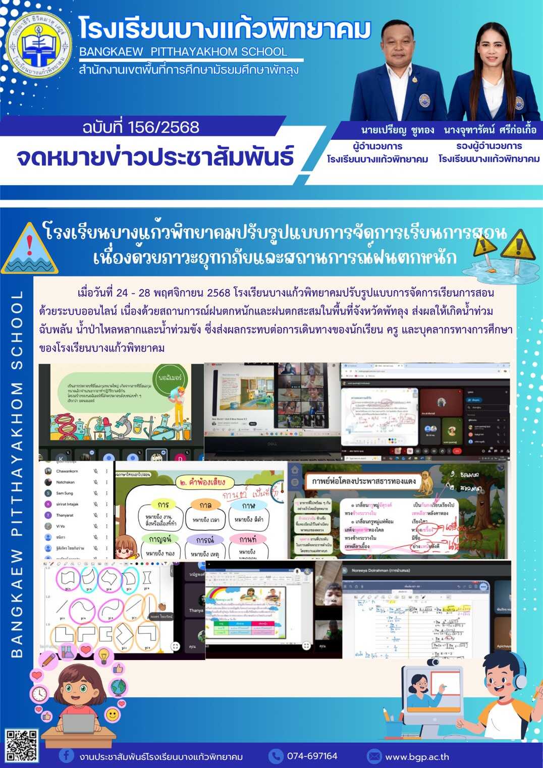 | เมื่อวันที่ 24 - 28 พฤศจิกายน 2568 โรงเรียนบางแก้วพิทยาคมปรับรูปแบบการจัดการเรียนการสอนด้วยระบบออนไลน์ เนื่องด้วยสถานการณ์ฝนตกหนักและฝนตกสะสมในพื้นที่จังหวัดพัทลุง ส่งผลให้เกิดน้ำท่วมฉับพลัน น้ำป่าไหลหลากและท่วมขัง ซึ่งส่งผลกระทบต่อการเดินทางของนักเรียน ครู และบุคลากรทางการศึกษาของโรงเรียนบางแก้วพิทยาคม |