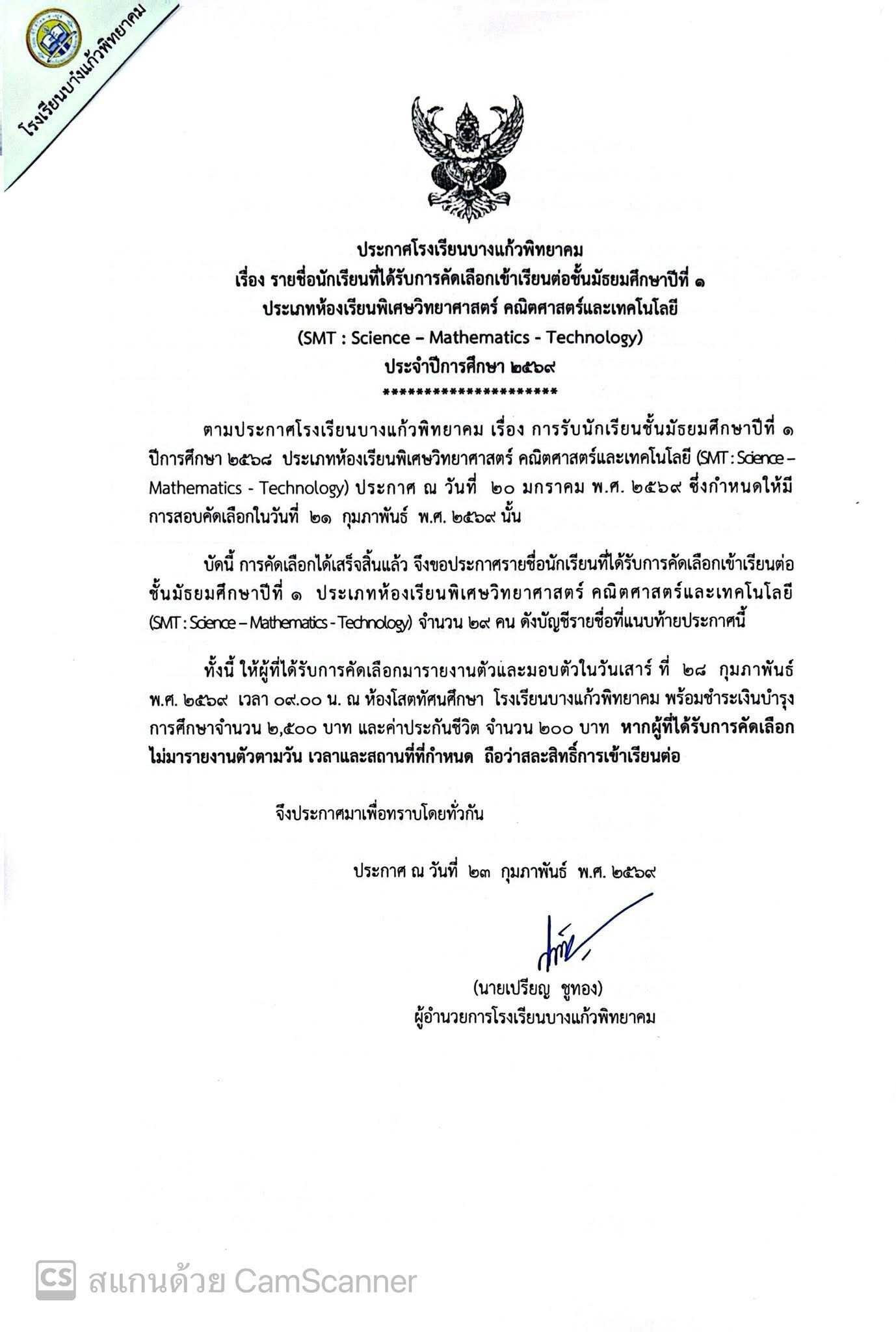 ประกาศโรงเรียนบางแก้วพิทยาคม เรื่องรายชื่อนักเรียนที่ได้ รับการคัดเลือก ต่อชั้นมัธยมศึกษาปีที่ 1 ห้องเรียนพิเศษ วิทยาศาสตร์คณิตศาสตร์ และเทคโนโลยี (SMT) ประจำปีการศึกษา 2569